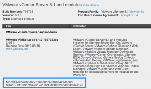 Now that vSphere 5.1 and assorted products have been released into the wild, how do you check the integrity of your downloaded file? As you might be aware of, VMware publishes both MD5 and SHA1 hashes for their files, making it possible to check if the file you just downloaded is identical to the file offered from VMware.